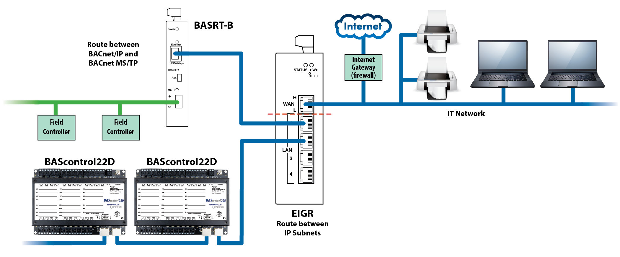 Systems integrators may encounter the need to add more BMS devices at a job site. Depending on the IP configuration at the site and IT policies, there may not be enough IP addresses available to integrate new BACnet/IP devices. The IT department may no longer be willing to support or allocate IP addresses for BMS devices. In this case, the IT department may ask the BMS contractor to configure a separate network for their BMS devices. In these situations, a Contemporary Controls EIGR IP router can be used to set up a separate subnet for the BMS devices, and the WAN port of the IP router can be connected to the IT network.