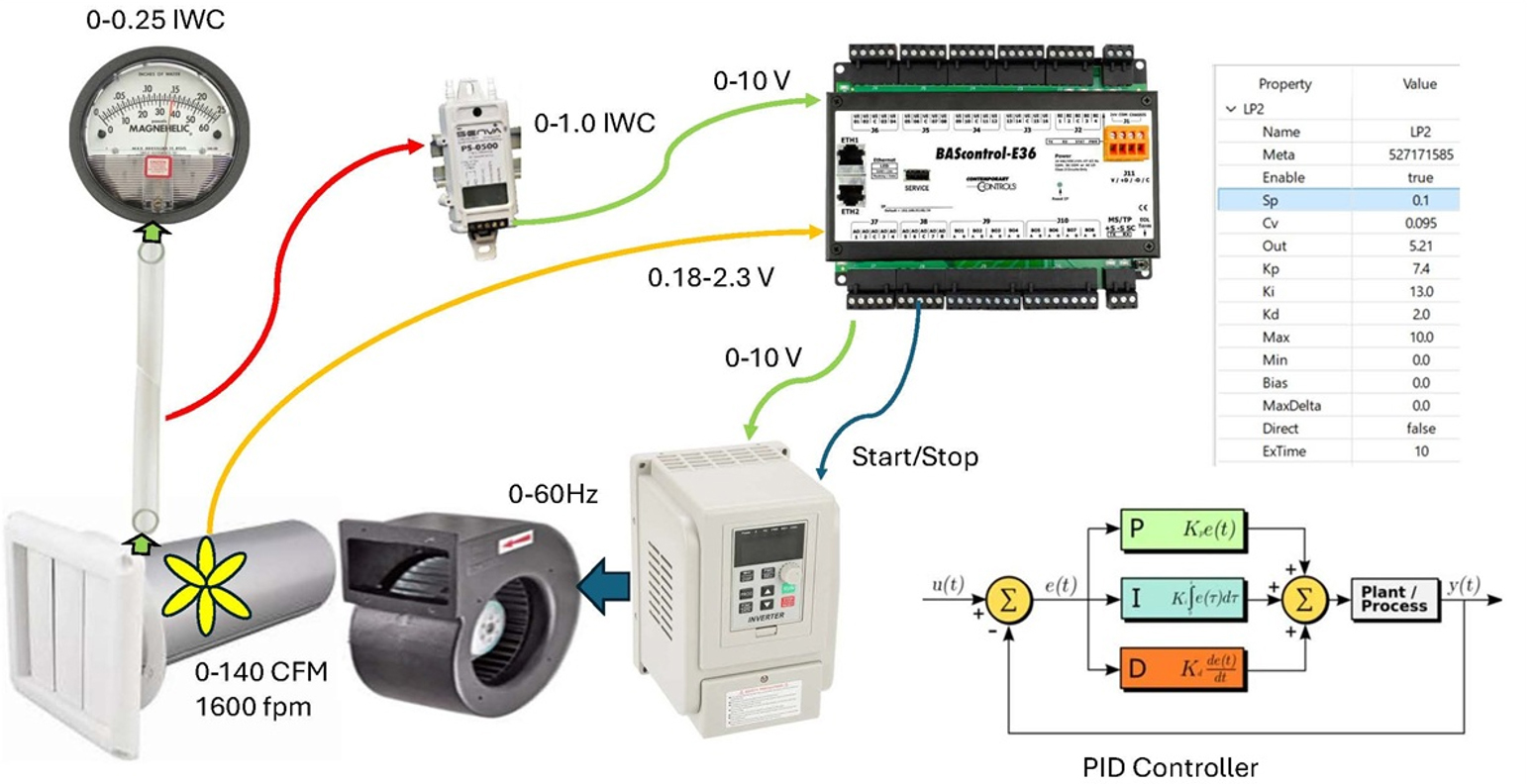 Using a centrifugal fan, small ductwork, variable louver, and variable speed drive (VFD), the system reliably simulates static pressure between 0–0.5 inches of water column (IWC)—a common pressure measurement in clean room environments. At the core, the BAScontrol-E36 runs PID control loops programmed using Contemporary Controls' Sedona Application Editor (SAE), allowing users to adjust setpoints, visualize system response, and observe how the controller maintains pressure despite disturbances.